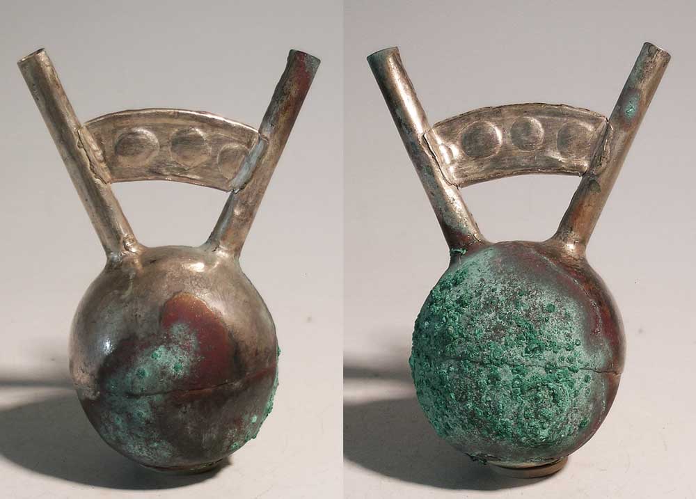 Lambayeque Silver vessel from Peru, ca. 700 - 1300 AD. A rare Lambayeque (Sican) silver vessel from Peru, ca. 700 - 1300 AD. This fine double-spout stirrup vessel is 4" high, is intact and covered with extensive deposits. Rare type. Value range: $550 - $750.