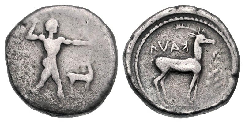 BRUTTIUM, Kaulonia. 470-440 BC. AR Stater (7.06 gm). Apollo advancing, daemon running on arm, stag in field / Stag standing. SNG.ANS.177. Toned Fine+. Rare.
