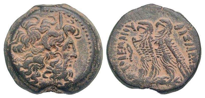 PTOLEMAIC KINGDOM. Ptolemy VI Philometor, 180-145 BC. AE30 Hemidrachm (22.16 gm). Diademed head of Zeus-Ammon / Two eagles standing on thunderbolt, cornucopiae. SNG.Cop.309. VF+, olive brown patina with earthen highlights. Choice.