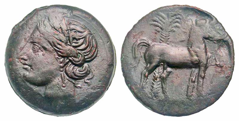 ZEUGITANA, Carthage. 241-146 BC. AE28 (18.66 gm). Head of Tanit / Horse standing with palm behind. SNG.Cop.340. VF+, brown patina, planchet flaw on reverse.