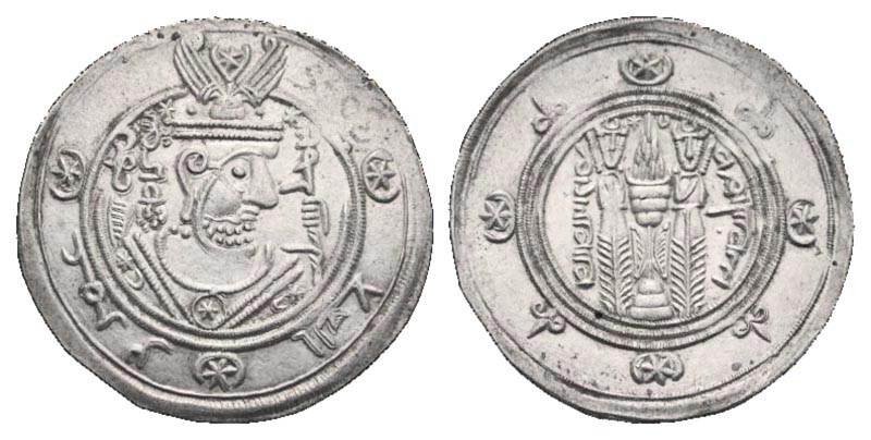 TABARISTAN. Umar ibn al-Ala, 771-780/1 AD. AR Half Drachm (1.95 gm), PYE 125. Crowned draped Sasanian bust / Fire-altar with attendants. Malek.77.1. Lightly toned Near Mint.