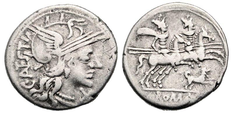 ROMAN REPUBLIC. C. Antestius, 146 BC. AR Denarius (3.77 gm). Helmeted head of Roma / The Dioscuri riding holding lances, dog below. Antestia.1. Cr.219/1e. aVF.