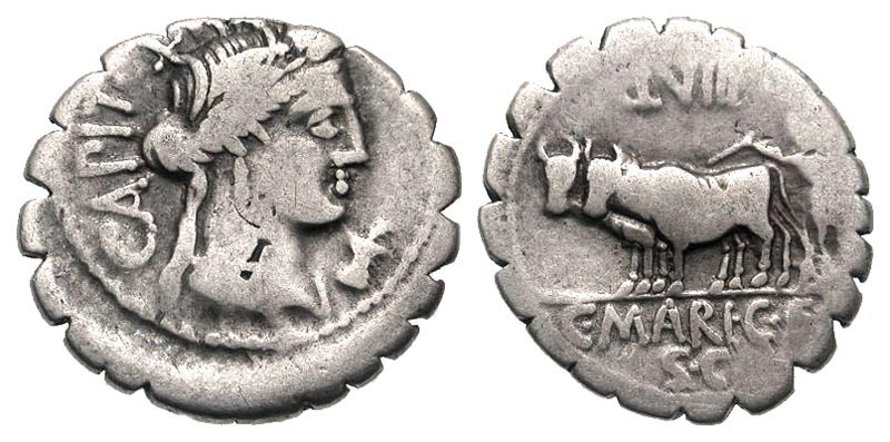 Lot 45-174. ROMAN REPUBLIC. C. Marius C.f.Capito, 81 BC. AR Serrate Denarius. ex K. Vaughn collection.