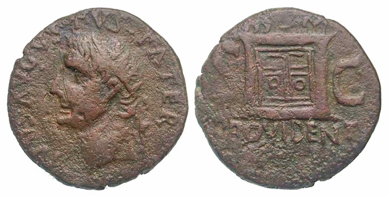 AUGUSTUS, 27 BC-14 AD. AE As (10.17 gm), commemorative struck under Tiberius, 22-30. Radiate head left / Altar with double paneled door. RIC.81. aVF, brown patina.