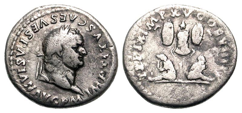 TITUS, 79-81 AD. AR Denarius (2.64 gm). Laureate head / Two Jewish captives seated at foot of trophy. RSC.307. RIC.II.103(R2). Toned aVF. Rare. Reference to his defeat of the Jews.
