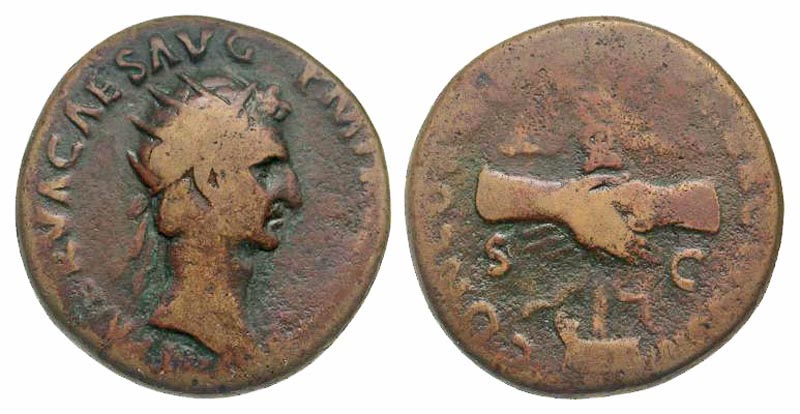 NERVA, 96-98 AD. AE Dupondius (10.44 gm), 96. Radiate head / Clasped hands. RIC.55. Fine, brown patina. ex. Lustig collection.