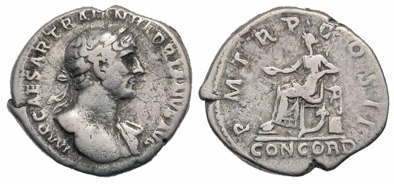 HADRIAN, 117-138 AD. AR Denarius (3.35 gm) 118 AD. Laureate heroic bust / Concordia saeted holding patera, under her arm a staure of Spes. RIC.39a. aVF.