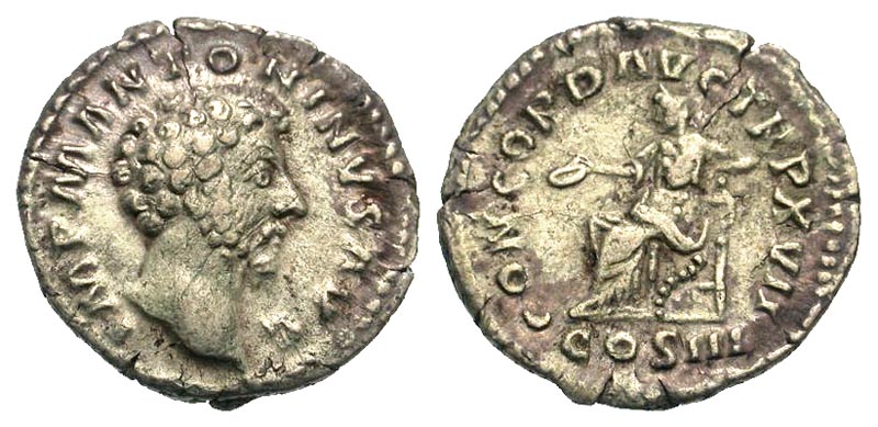 MARCUS AURELIUS, 161-180 AD. AR Denarius (2.95 gm). Bare head / Concordia seated holding patera and resting arm on statue of spes. RIC.58. Toned VF.