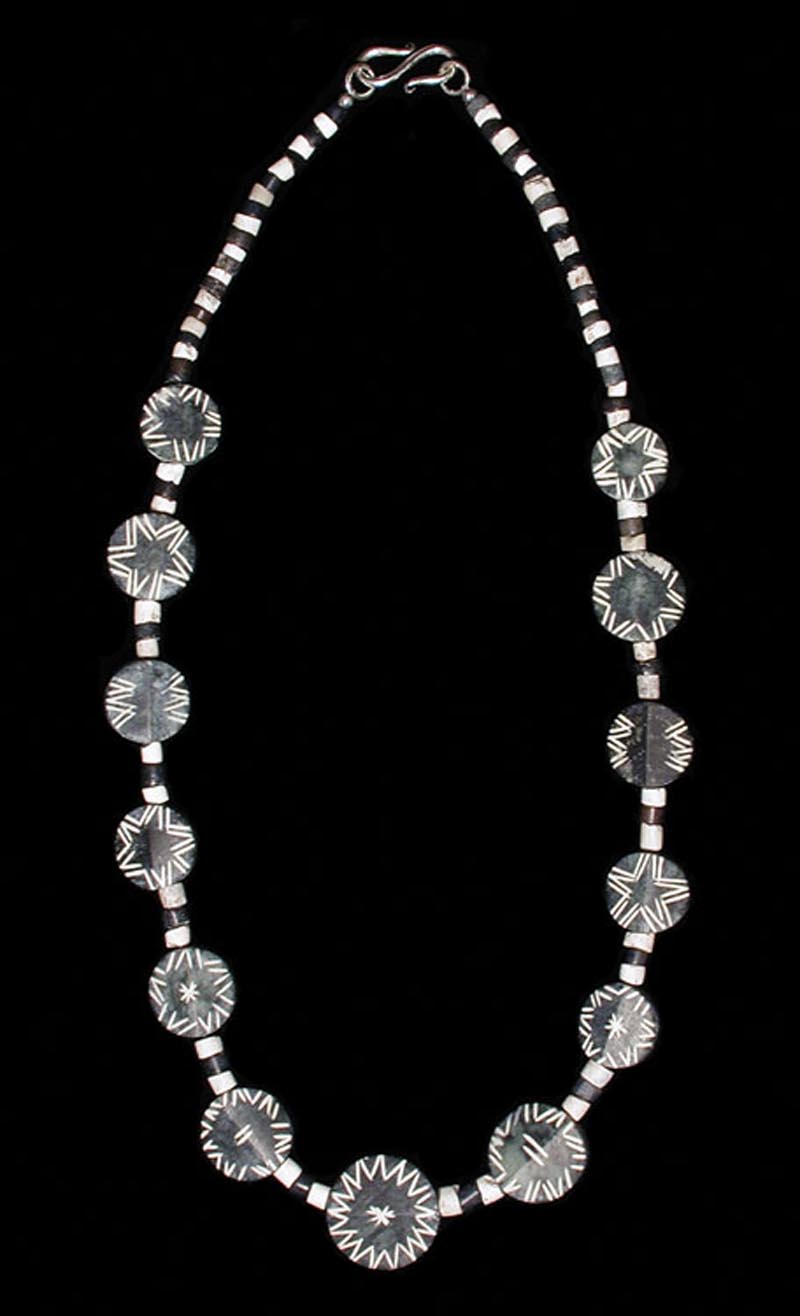 Mixed Hardstone bead Necklace. Consisting of Sumerian (ca. 2200 BC) gray and white stone short tubular beads strung with 12 large Central Asiatic "Buddhist" (200 BC - 500 AD) etched green-black jadeite tablet beads (16 - 21 mm). 19" long, restrung with modern clasp. Unusual and impressive. We have sold the etched beads alone for over $100 each.