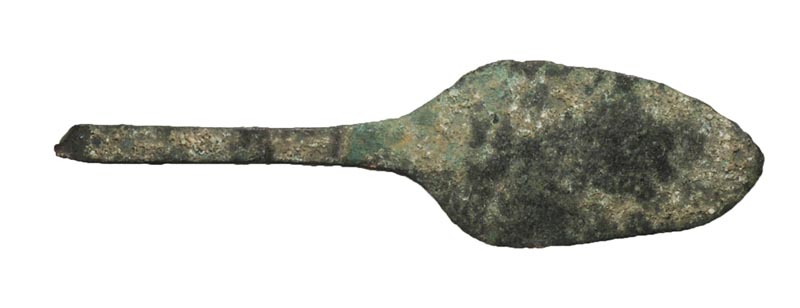 Bronze Arrow Head. Luristan, 1200-800 BC. Wide leaf-shaped double edged blade and rounded shoulders, and long tang. 3.5" long. Moorey.73v. Green-black patina, slight bend.