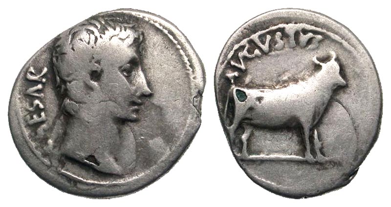 Augustus. 27 B.C.-A.D. 14 AR denarius (20.1 mm, 3.23 g, 5 h). Samos(?) mint, struck ca. 21-20 B.C. CAESAR, bare head right / AVGVSTVS, young bull standing right, head erect. RIC 475; BMCRE 663; RSC 28. Fine.