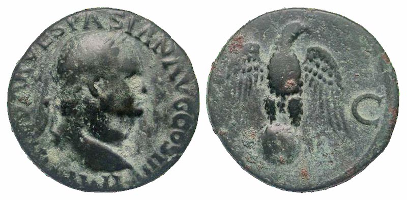 Vespasian. A.D. 69-79. AE as (26.8 mm, 9.7 g, 6 h). Rome mint, dated A.D. 71. IMP CAES VESAPSIAN AVG COS III, laureate head right / S-C, eagle, head right, perched atop globe with wings half spread. RIC 322; BMCRE 612. Fine, blue-green patina.