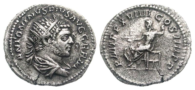 Caracalla. A.D. 198-217. AR antoninianus (23.3 mm, 4.56 g, 1 h). Rome mint, struck A.D. 215. ANTONINVS PIVS AVG GERM, radiate, bearded, draped, and cuirassed bust right, seen from behind / P M TR P XVIII COS IIII P P, Jupiter seated left, holding victory on a globe and scepter; eagle at his feet. RIC 260b; RSC 277. Toned VF, small flan crack, light porosity.