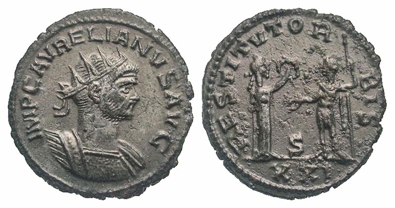 Aurelian. A.D. 270-275. AE antoninianus (22.6 mm, 3.46 g, 5 h). Antioch mint, struck A.D. 275. IMP C AVRELIANVS AVG, radiate and cuirassed bust right / RESTITVTOR ORBIS, woman standing right, presenting wreath to Aurelian, standing left, holding scepter; S/XXI in exergue. RIC 386. EF, fully silvered, some pitting in fields.