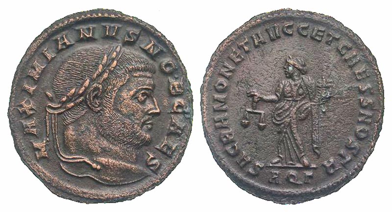 Galerius. As Caesar, A.D. 293-305. AE follis (27.4 mm, 9.66 g, 6 h). Aquileia mint, struck A.D. 300. MAXIMIANVS NOB CAES, laureate head right / SACRA MONETA AVGG ET CAESS NOSTR, Moneta standing left, holding scales and cornucopia; AQP in exergue. RIC 30b. VF.