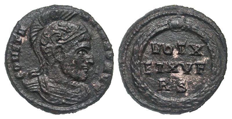 Constantine I. A.D. 307/10-337. AE 3 (19.0 mm, 3.03 g, 5 h). Rome mint, struck A.D. 320. CONSTANTINVS AVG, helmeted and cuirassed bust right / VOT X/ ET XV F, RS, all within wreath. RIC 207. VF. Rare.