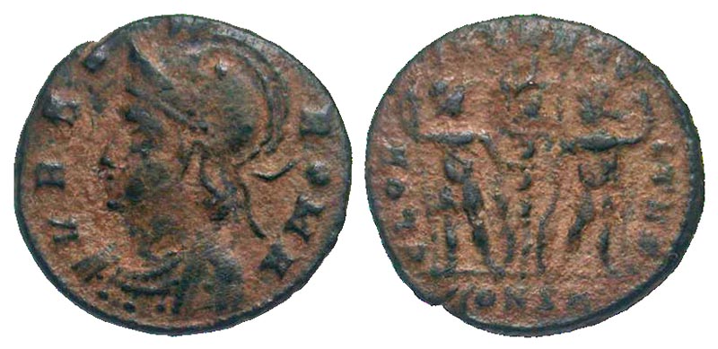 City Commemorative . A.D. 330-354. AE 4 (15.6 mm, 1.56 g, 5 h). Constantinople mint, struck A.D. 336-337. VRBS ROMA, crested and helmeted bust of Roma left wearing imperial mantle / GLORIA EXERCITVS, two soldiers standing either side of one standard; CONSA in exergue. RIC 154; LRBC 1038. VF, black patina with red highlights.