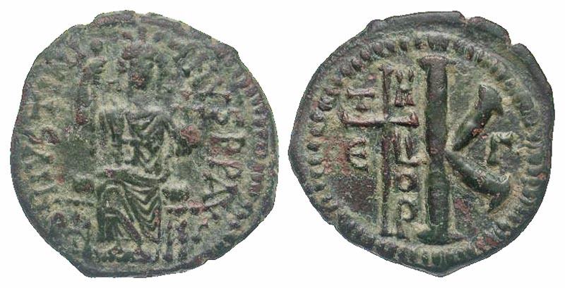 Lot 46-228. Justinian I. 527-565. AE half follis. Antioch mint. Scarce.