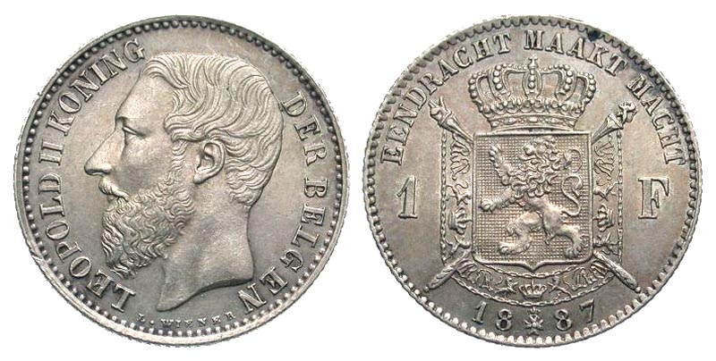 Lot 46-269. Belgium. Leopold II. 1887-1896. AR 1 franc. Brussels mint, dated 1887.