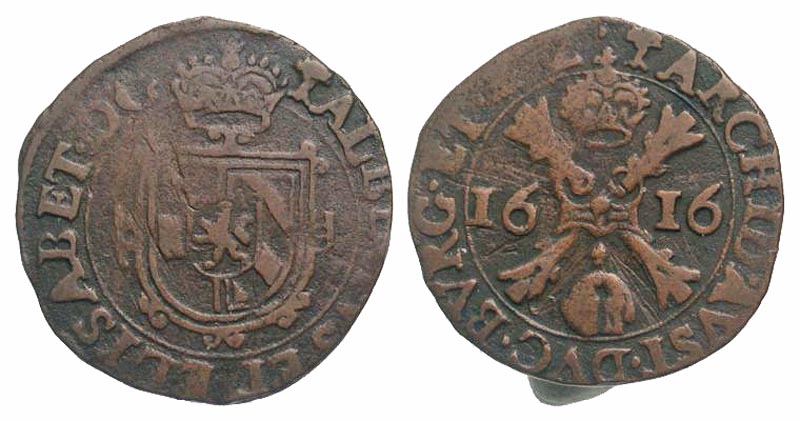 Lot 46-285. Netherlands, Brabant. Albert & Isabella. 1598-1621. Æ 1/2 liard. 's Hertogenbosch mint, Dated 1615.