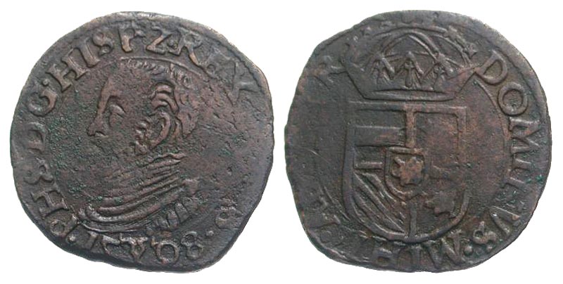 Lot 46-287. Netherlands, Brabant. Philip II. 1556-1598. Æ 1/2 liard. 's Hertogenbosch mint, Dated 1598.