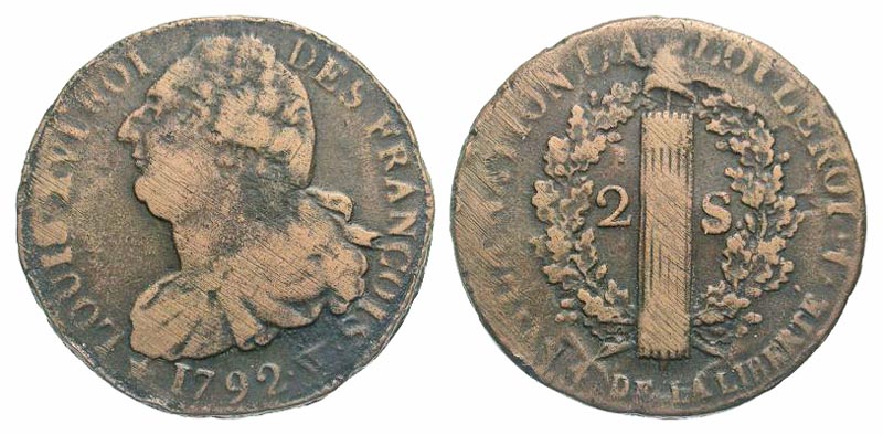 Lot 46-288. France, Royal. Louis XVI. 1774-1793. CU 2 sols. Constitutional issue. Lille mint, dated 1792.