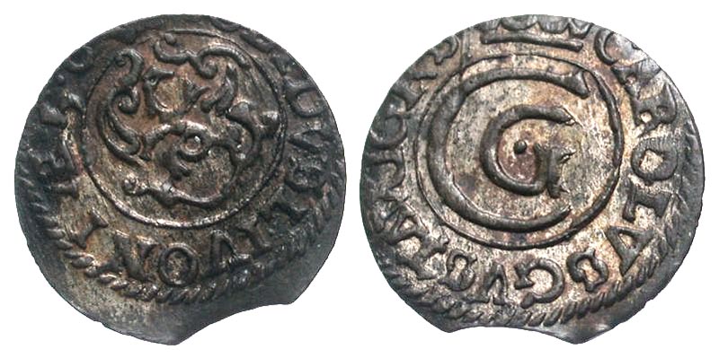 Livonia, Under Sweden. Karl X Gustav. 1654-1660. BI solidus (15 mm, 0.49 g, 12 h). Dated (16)56. Crowned CG monogram in inner circle / Arms. Ahlstrom 16. EF, nice silvering.