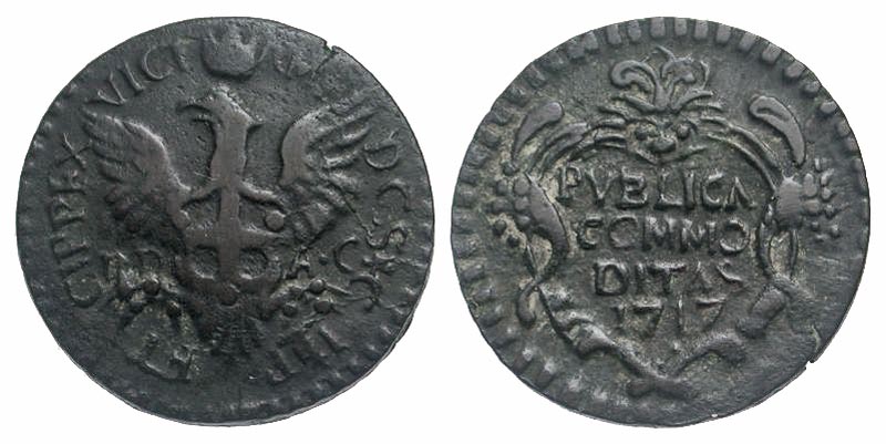 Italian States, Sicily. Vittorio Amedeo II of Savoy. 1713-1719. Æ grano (24 mm, 4.59 g, 7 h). Palermo mint, Dated 1717. Crowned displayed eagle, shield of Savoy arms on breast / Four-line inscription with date in baroque frame. Spahr 21; KM 84. VF.