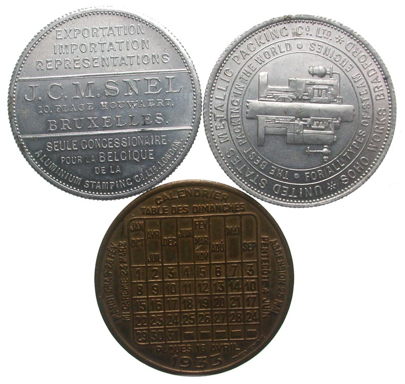 [Medals & Tokens]. Lot of three early 20th century calendar medals. Includes: Belgium, Brussels. J.C.M. Snel, Import Export. 1907-1927. AL 29mm. AU // France, Paris. 1933. Æ 40mm. EF // USA. United States Metallic Packing Co., Ltd. 1911-1931. AL 39mm. Unc.
