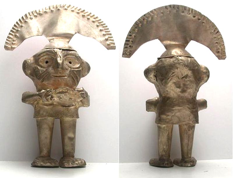 Debased Silver Moche Shaman from Peru, ca. 400 - 700 AD. A fine Moche figure from Peru, ca. 400 - 700 AD. This standing shaman is 6 tall and is depicted holding a bowl. He wears an impressive headdress. Value range: $500-$750.