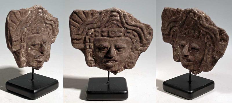 Zapotec Head from Mexico, ca. 100 - 500 AD. A large Zapotec head fragment from Oaxaca, Mexico, ca. 100 - 500 AD. It is 4 wide, 3-1/4 high and depicts the God with the Headdress Composed of the Upper Jaw of a Serpent. It is superbly detailed, has heavy mineral encrustation and is mounted. Ex Schultz collection. Value range: $175 - $250.