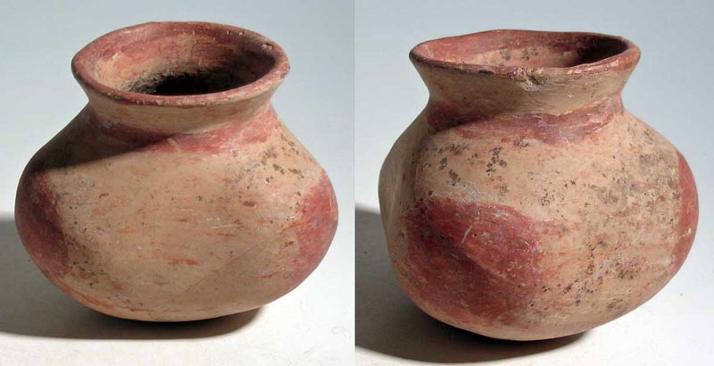 Jalisco Tri-Lobe Jar from Mexico, ca. 200 BC - 350 AD. An unusual Jalisco bi-chrome vessel from West Mexico, ca. 200 BC - 350 AD. This fine tri-lobe example is 4 in diameter and is decorated with red paint over cream slip. Nice mineral deposits overall. Ex Cohen estate. Value range: $100 - $200.