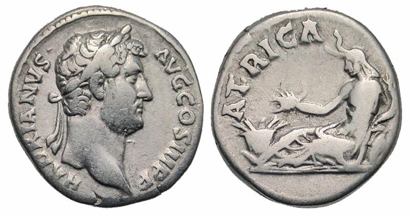 Hadrian. A.D. 117-138. AR denarius (17.8 mm, 3.20 g, 7 h). Rome mint, ca. A.D. 134-138. HADRIANVS AVG COS III P P, laureate head right / AFRICA, Africa reclining left, wearing elephant's skin headdress, holding scorpion and cornucopia; basket to left. RIC 299f; BMC 821; RSC 141b. aVF.