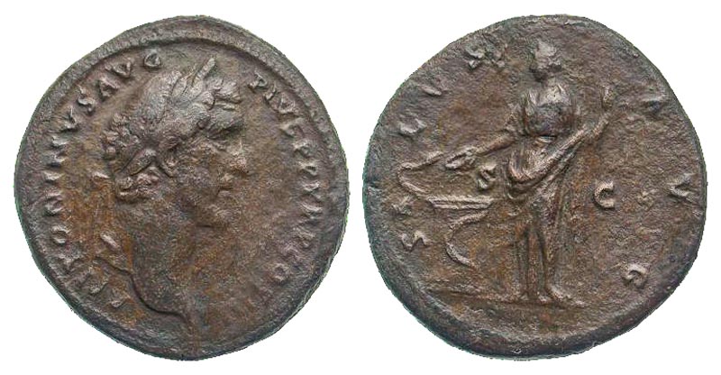 Antoninus Pius. A.D. 138-161. AE sestertius (33.9 mm, 22.19 g, 11 h). Rome mint, struck A.D. 140-144. ANTONINVS AVG PIVS P P TR P COS III, laureate head right / SALVS AVG, S-C, Salus standing left, holding patera and scepter, feeding serpent rising from altar. RIC 635a; BMCRE 1303. aVF, porous, brown patina.