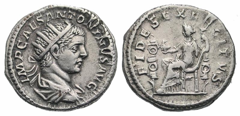 Elagabalus. A.D. 218-222. AR antoninianus (22.1 mm, 5.24 g, 5 h). Rome mint, struck A.D. 219. Scarce. IMP CAES ANTONINVS AVG, radiate, draped, and cuirassed bust right / FIDES EXERCITVS, Fides seasted left, holding eagle and standard, another standard to left. RIC 67; RSC 28a; BMCRE 107. EF/VF.