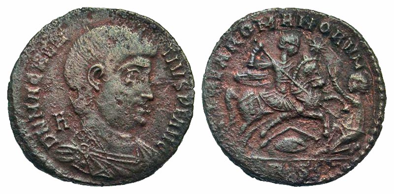 Magnentius. A.D. 350-353. AE centenionalis (23.8 mm, 4.61 g, 5 h). Rome mint, struck A.D. 351-352. DN CONSTANTIVS PF AVG, pearl-diademed, draped, and cuirassed bust right; A behind head / GLORIA ROMANORVM, emperor on horseback right, spearing a fallen horseman, shield and broken spear beneath horse, star above; RS in exergue. RIC 209; LRBC 638. aVF, red highlights.