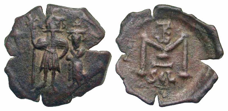 Constans II. 641-668. AE follis (24.6 mm, 3.32 g, 7 h). Syracuse mint. Constans with long beard, on left, left hand on hip, right hand holding long staff, and Constantine IV, unbearded, on right, holding holding globus cruciger / Large M; monogram above, SCL. SBV 1109; DOC 180. aVF, flan chip.