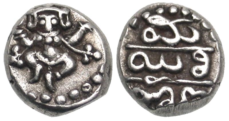 India, Princely States. Mysore. 1799-1810. AR 1/3 pavali (8.4 mm, 0.87 g, 2 h). Dancing figure of Balakrishna / Kanarese legend "Mayili Hana". KM C200A. EF.