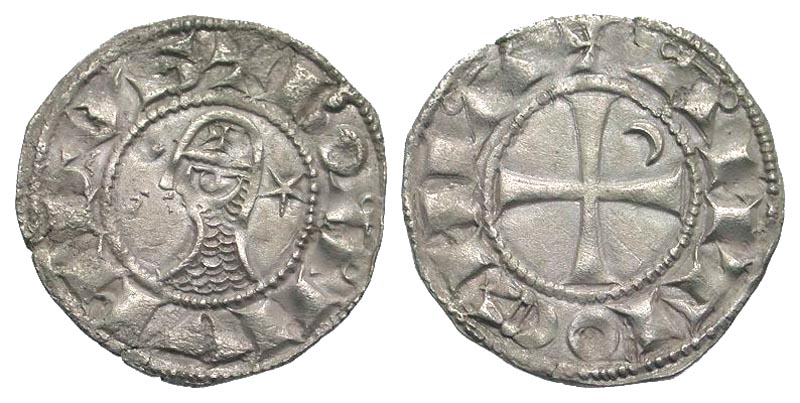 Crusader States, Principality of Antioch. Bohemond III. 1163-1201. BI denier (18.2 mm, 1.04 g, 4 h). + BOAMVИDVS, armored bust left; crescent and star in fields / + AИTIOCИIA, short cross with crescent in 2nd angle. Metcalf 388-91; CCS 66b. Good VF.