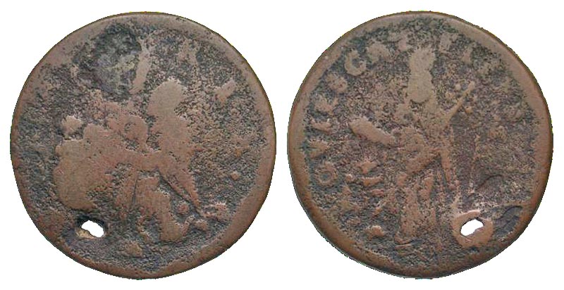 After Charles I was executed and the Puritans suppressed everything Catholic, these coins went into hiding, as possessing them was a crime. After Charles II came to power in 1662, the St. Patrick coins returned to circulation in Ireland, where they circulated for a time, until 1679 when they were declared uncurrent. The farthings and half pennies still circulated in Ireland. Mark Newby was a Quaker and had experienced religious persecution in the Dublin area, Newby decided to join his fellow Quakers in their American settlement in New Jersey. Thinking that small change may be in short supply, Newby purchased £30 of these coppers, approximately 14,400 pieces. Newby arrived in America in late 1681 and was soon politically well connected, enough so to get his coppers declared legal tender. Newbie died in 1682, but the coppers he brought over circulated for well over 100 years.