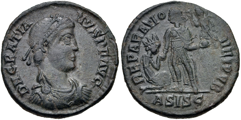 Gratian. A.D. 367-383. AE (23 mm, 5.51 g, 6 h). Siscia, A.D. 378-383. D N GRATIA-NVS P F AVG, diademed, draped, and cuirassed bust right / REPARATIO REIPVB, emperor standing left, raising kneeling, turreted woman to left, holding Victory on globe; ASISC. RIC 26a.1; LRBC 1512. VF, green patina, traces of deposits, cleaning scratches.