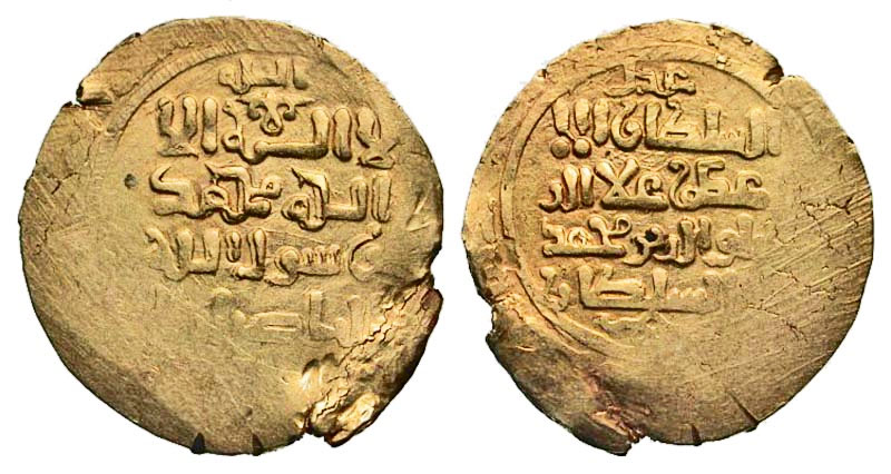 Khwarizmshahs. 'Ala al-Din Muhammad II. 596-617/1200-1220. AV dinar (26.3 mm, 6.89 g, 1 h). Album 1712. aVF, bent, areas of flat strike.