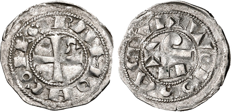 France, Toulouse. Raymond V-VII. 1148-1249. AR obol (15 mm, 0.51 g, 9 h). RAMON CO(ME)S (S sideways), short cross pattée; S in second quarter / + TOLOSΛ CIVI (S sideways), P Λ X clockwise in center. Duplessy 1229; Poey d'Avant -; Boudeau 722; cf. Roberts 4226 (denier). Good VF.