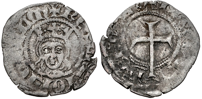 Spain, Majorca. Jaume II. 1276-1311. AR dinero (17 mm, 0.67 g, 11 h). + RЄX MΛIORICΛRUM, crowned facing bust / + IACOBUS | DЄI GRA :, Latin cross. Crusafont 539; ME 2051 (Jaume III); Burgos 1393 (Jaume III). Near VF.