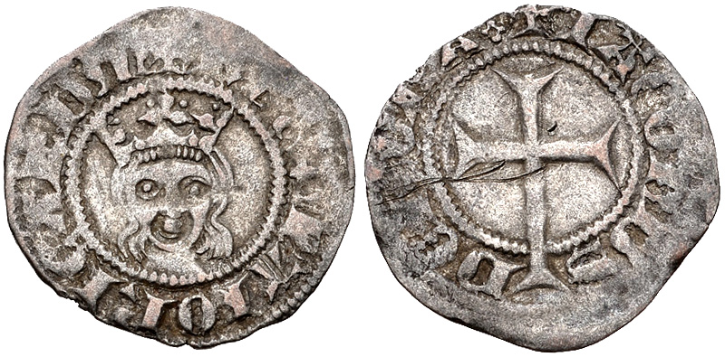 Spain, Majorca. Jaume II. 1276-1311. AR dinero (17 mm, 0.75 g, 6 h). + RЄX MΛIORICΛRUM, crowned facing bust / + IACOBUS | DЄI GRA :, Latin cross. Crusafont 539; ME 2051 (Jaume III); Burgos 1393 (Jaume III). Near VF, a few light scratches on the reverse.