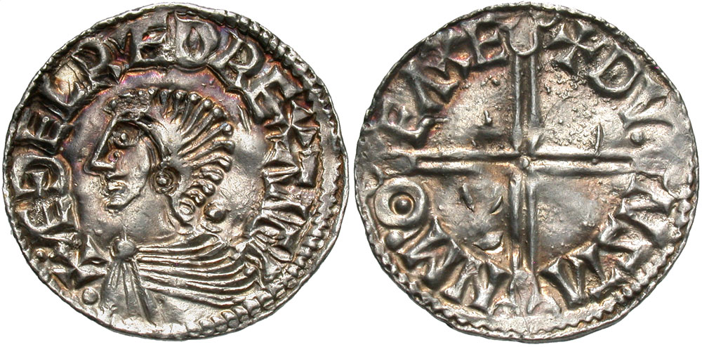 Lot 48-317. Anglo-Saxon. Aethelred II. 978-1016. AR penny. Long Cross type. Exeter. Dunstan, moneyer.