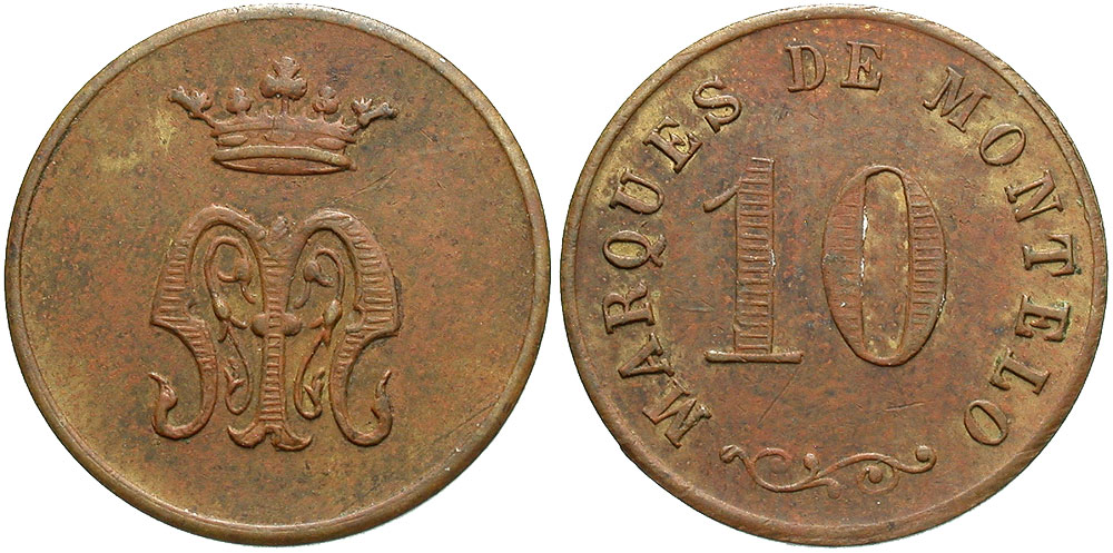 Cuba, Matanzas Province. Marquis of Montelo. Early 20th century 10 centavos token (18 mm, 1.69 g). Crowned M / MARQUES DE MONTELO, 10. LAT Mat36. VF.