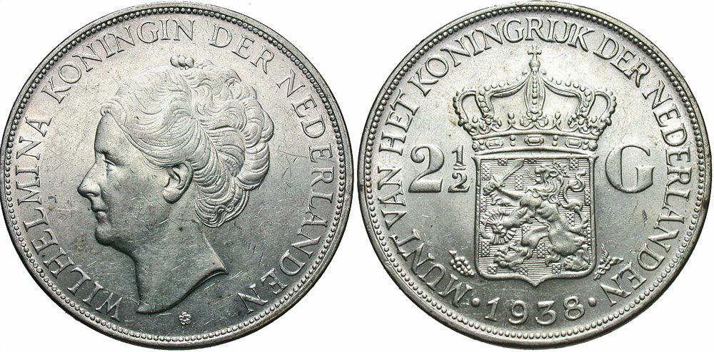 Lot 48-356. Netherlands. Wilhelmina. 1938. 2 1/2 gulden.