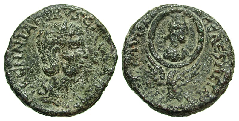 Samaria, Caesarea Maritima. Herennia Etruscilla. Augusta, A.D. 249-251. Æ 28 (27.8 mm, 17.74 g, 1 h). ERENNIA ETRVSCILLA, diademed and draped bust right / COL PR F AVG FC CAES METR, eagle standing slightly left, head right, supporting wreath with bust of Tyche right within. Kadman 165; Rosenberger 136. aVF, Syrian patina.
