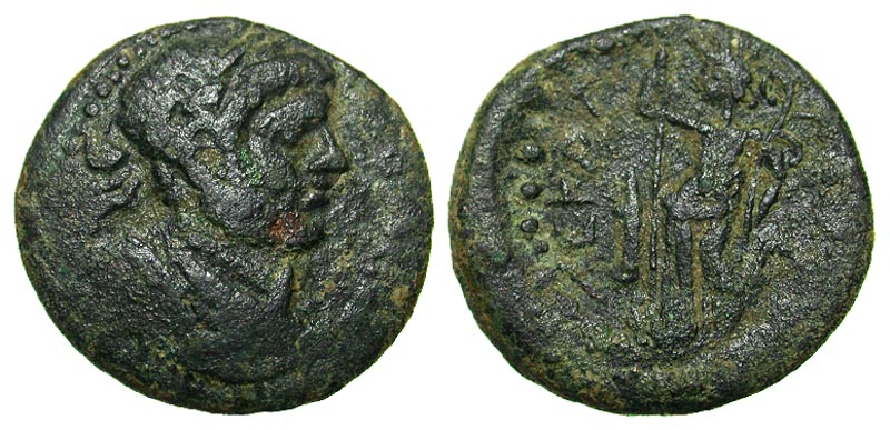 Judaea, Ascalon. Hadrian. A.D. 117-138. Æ 24 (23.7 mm, 10.70 g, 12 h). Laureate and draped bust right / Tyche-Astarte standing left on galley, holding scepter and aplustre; altar to left; to right, dove left above [date]. SNG Cop 40; cf. Roseberger 150. VG.